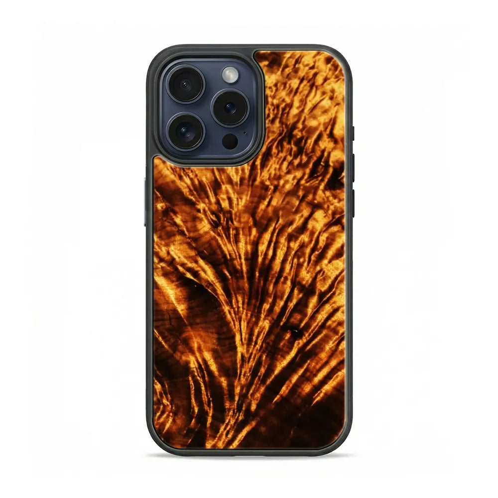 Crafted from natural Golden Phoebe wood, featuring a unique water ripple grain with a natural golden luster. The case boasts a sleek black bezel design that hugs your phone perfectly, delivering a sophisticated look and premium feel.
